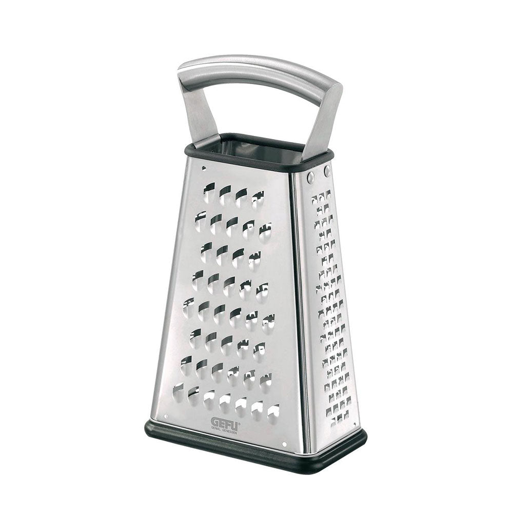 Die Vier-Wege-Reibe aus Edelstahl von GEFU Vitales mit Laser-Cut-Technologie sorgt für messerscharfe Schnittkanten und perfekte Reibergebnisse für lange Zeit. Dank seiner vier verschiedenen Reibemuster eignet er sich für alle Gemüsesorten sowie Käse, Schokoladen-Ingwer und Muskatnuss. Zu den vier Reibflächen gehören eine feine Reibe für Schokolade, eine Reibe für Gemüse/Weichkäse, eine Reibe für rohes Gemüse und ein Hartkäsehobel.