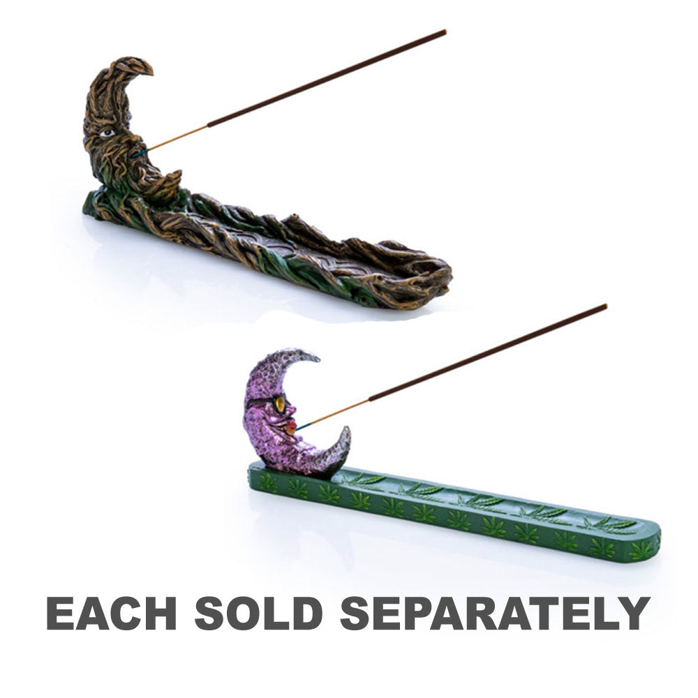 Horizontaler Weihrauchbrenner in Form einer rauchenden Mondsichel. Verfügt über ein Muster aus Unkrautsymbolen am unteren Rand. Hergestellt aus robustem Polyresin mit luxuriöser, schwerer Haptik. Geeignet für Räucherstäbchen.
