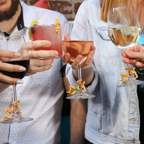 Vier hübsche Burschen, die Sie gerne bei einem Glas Wein kennenlernen möchten. Diese charmanten Kerle werden sich um Ihr Glas wickeln und dafür sorgen, dass Ihre Nacht einfach die beste ist, indem sie Ihr Getränk identifizieren und Verwechslungen vermeiden.
