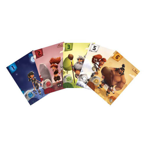 Lege die Tierplättchen auf das Hauptbrett und wähle dann die Ziele für das Spiel aus. Jeder Spieler nimmt sich die 12 Karten des Clans seiner Wahl und legt dann seine Höhle und die dazugehörigen Totemplättchen vor sich ab. Jeder Spieler zieht dann die ersten drei Karten seines Decks. Es ist ihre Starthand. Um das Tierplättchen zu sammeln, muss der neben jedem Plättchen angegebene niedrigste Wert erreicht werden. Die Spieler wählen gleichzeitig die Jäger, die sie senden möchten, aus ihrer Kartenhand aus. Der Spieler mit der niedrigsten Summe spielt zuerst, da seine Jäger die schnellsten sind. Der Spieler mit der höchsten Summe spielt zuletzt, kann aber mehr oder größere Tiere jagen. Obwohl sie langsamer sind, gibt es möglicherweise nichts mehr zu jagen ...