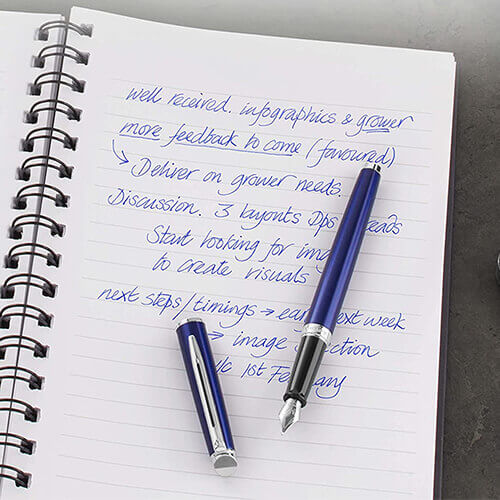 • Eine feine, federbedeckte Feder mit dem eingravierten Warenzeichen von Waterman.