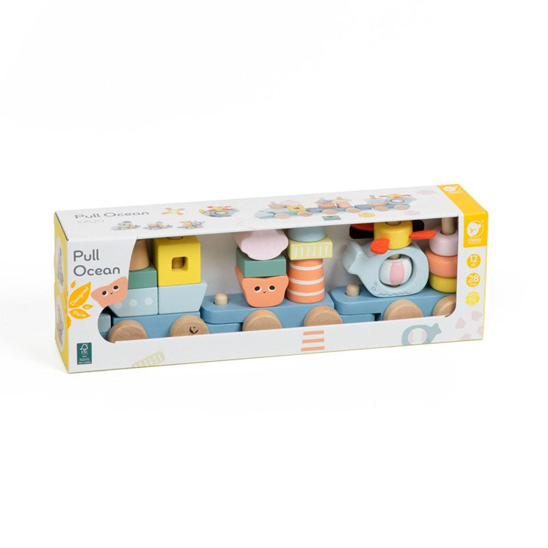 Wooden pull-along toy with marine-themed stacking blocks