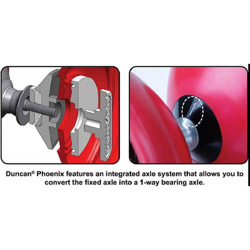 • INTERCHANGEABLE BEARING: No longer will diabolo players have to choose between a fixed axle and 1-way bearing diabolo. The unique Duncan Phoenix Diabolo interchangeable bearing design allows you to easily hand tighten the knobs of the to switch axles between fixed and spinning.