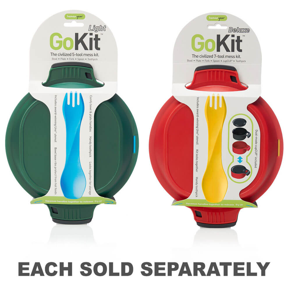 The GoKit plate and bowl feature a simple yet secure integrated locking mechanism. Other mess kits make you fiddle around with flimsy, rubber straps that break or get lost. Life's too short and we're hungry people! With GoKit, you just unclick the two halves so you're eating in no time. Holes in the plate handles make it a cinch to attach a carabiner and hang a GoKit on the outside of your bag.