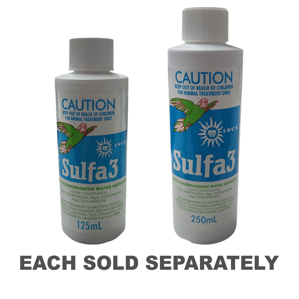 Inca Sulfa 3 Inca Sulfa 3 is a safe antibiotic formula designed to treat bacterial enteritis, respiratory disease, chlamydia, and coccidiosis in caged ornamental birds such as canaries, budgerigars, finches, cockatoos, and doves. It comes ready to add to water and should replace your bird's daily drinking supply. Inca Sulfa 3 should not be given to birds bred for the production of eggs and meat.