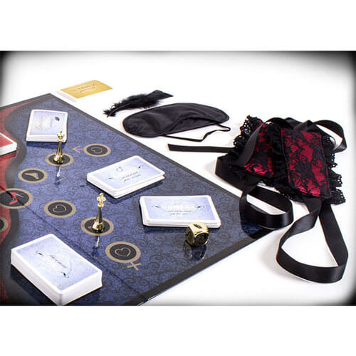 • What’s in the box: 252 cards; game board; 2 metal pawns; metal dice; stylish handcuffs; blindfold; whip; feather; scented candle; rose petals; rulebook