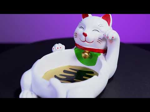 • Cat is designed in a traditional white colour and wears a green bib and golden bell