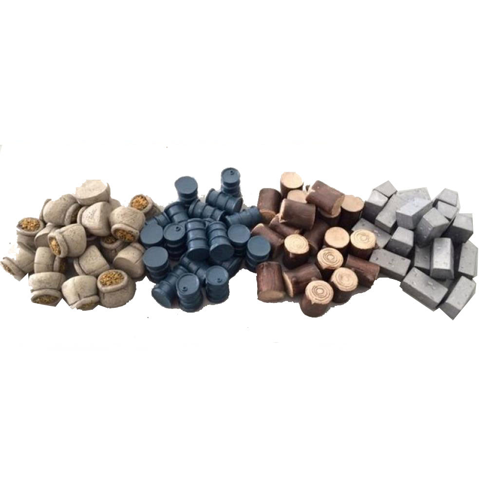 • Included are 80 tokens: 20 Grain sacks (food), 20 Iron ingots (metal), 20 Oil barrels (oil), 20 Chopped wood (wood)