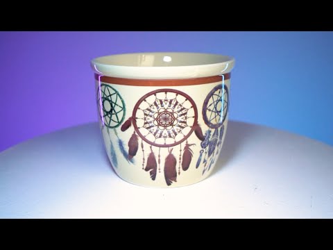 • Feathered dreamcatcher design on a cream-colored bowl.