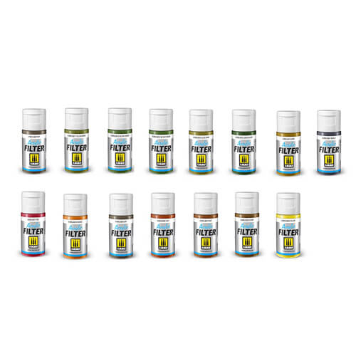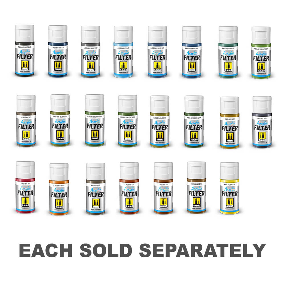 AMMOs nye akrylfiltre er designet til at blive anvendt direkte på modellen. Dette nye interval giver dig mulighed for at tilføje farvevariation til dine miniatyrer, harmonisere forskellige camouflagefarver eller skelne områder med en anden tone. Akrylfilteret kan let påføres med en børste, der undgår behovet for kompliceret maskering. Fugtig børsten med produktet og påfør den uden at oversvømme overfladen. Takket være den innovative formulering kan de akrylfiltre retoucheres eller elimineres enkelt og let med vand i løbet af den forlængede tørre tid, hvert filter tørrer helt på 24 timer. Disse alsidige filtre kan også anvendes af Airbrush for et uendeligt antal effekter. Takket være den brede vifte af 30 tilgængelige farver, behøver du ikke at foretage komplekse blandinger, justere for det rette tyndforhold eller justere tonen til den tilsigtede skygge. Hver farve kan blandes med hinanden eller tones med andre ammo -akryl. De akrylfiltre kan fortyndes og rengøres med Wat