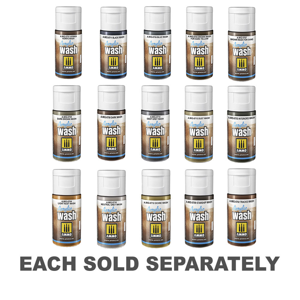 Vask er en af de ældste og mest essentielle modelleringsteknikker, der bruges af alle modeller på emner og dioramas af alle typer og temaer. Udviklet med to forskellige formuleringer til at omfatte både emaljetype og akryltype. Hver type har forskellige kvaliteter til at tilpasse sig de forskellige behov i vores modeller og præferencerne for hver modeller for efterspørgsel. Begge tilbyder fremragende resultater og er meget lette at anvende. Fordelen ved akrylvask er, at den ikke har nogen toksicitet eller lugt, så det ikke er et problem at bruge den derhjemme eller i nærheden af din familie . Akrylvasken leveres i en flaske med en doseringshætte, der giver dig mulighed for at placere et par dråber på en palet eller en beholder til senere brug. Selvom flaskens kapacitet er 15 ml, giver dispenseren dig mulighed for at gemme produkt og arbejde med mere præcision. Disse nye vaske findes i en lang række farver, så du kan have alle muligheder for din