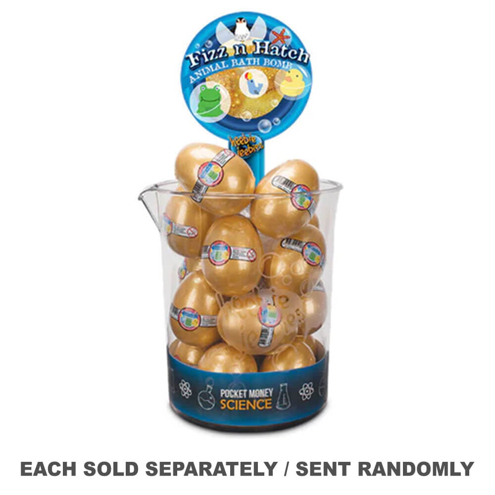 Placer denne gyldne ægbadbombe i vand, se den fizz væk, og find derefter et overraskende dyrelegetøj inde.
