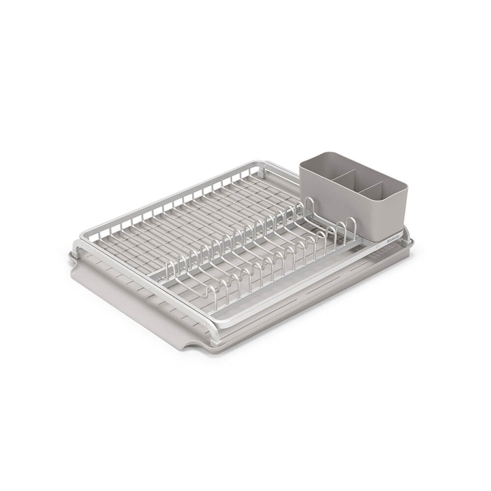 Brabantia Dish Drainer har et elegant design, der tilbyder masser af plads til tørring af retter. En speciel base sikrer, at overskydende vand drænes direkte i tragten, så din arbejdsoverflade forbliver tør og ren. Det har en trådramme lavet af rustfrie materialer og er udstyret med en aftagelig bestikholder.