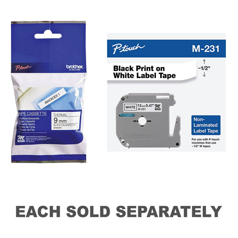P-touch M-231 ½ ”(0,47") sort-på-hvidt bånd giver dig mulighed for at skabe fed, men alligevel let at læse etiketter, der er lette at skrælle, perfekt til indendørs brug. Denne halv tomme (0,47 tommer ) Standard direkte termisk ikke-lamineret p-touch-tape er modstandsdygtig over for vandskader og vil ikke smøre eller udtværere. er perfekte til mærkning af køkken, hylder og forsyningsskabe Bagsiden af p-touch-båndet kan fjernes med lethed, hvilket gør Brother M-udskiftning af etikettape let at skrælle og påføre borde og hylder lavet af stål, træ, plast og mere.
