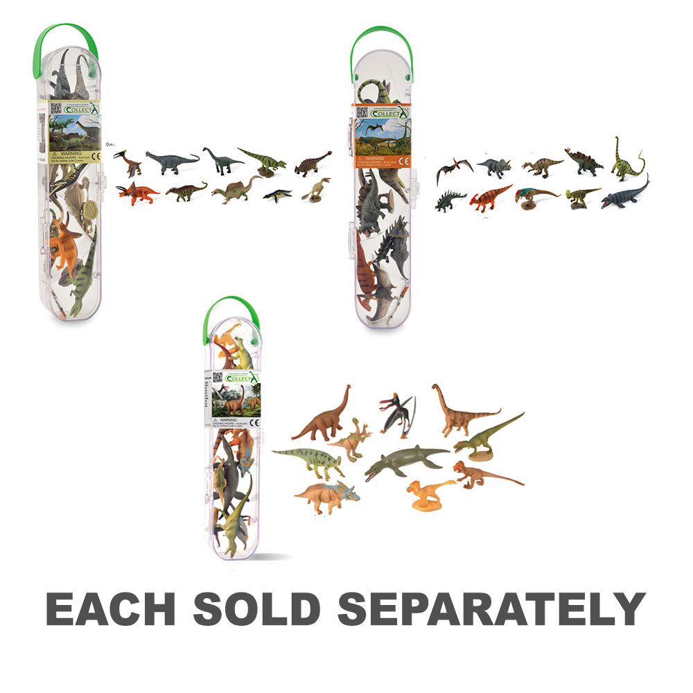 Dette sæt af 10 mini -dinosaurier i en klar bærehent fra Collecta inkluderer 1 af hver af følgende dinosaurier: Ankylosaurus, Apatosaurus, Velociraptor, Brachiosaurus, Liopleurodon, Giganotosaurus, Amargasaurus, Quetzalcoatlus, Torosaurus, spinosaurus.