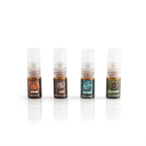 - 4 Element og æterisk olieblandinger: Brand/orange, vand/bergamot, luft/citron eukalyptus, jord/cedertræ.