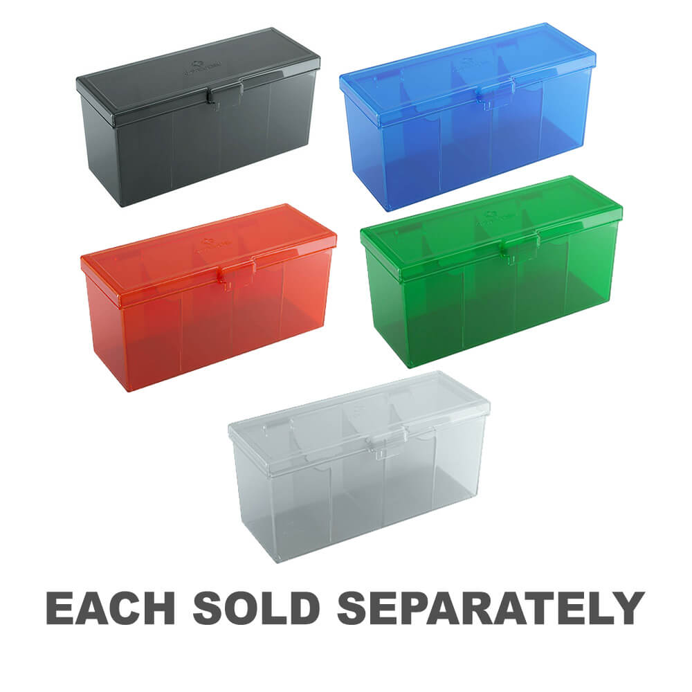 Fuld dæk, terninger, tokens eller 320 dobbeltærmet kort: Der er meget, som Fourtress kan indeholde og beskytte! Denne robuste boks fås i 5 forskellige halvtransparente farver, hvilket gør det muligt at identificere dens indhold let. Den integrerede lås holder den sikkert lukket, mens to indvendige vægge kan fjernes for at skabe større rum. Kasserne kan stables, så de er begge perfekte rejsekammerater og en god opbevaringsløsning derhjemme.