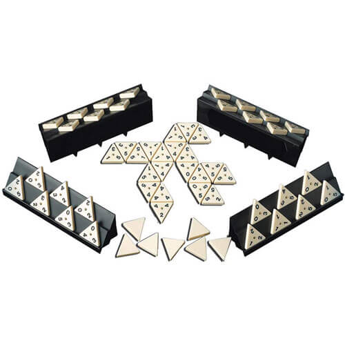 Det klassiske trekantede Domino -spil. Resultatpoint ved at matche numre på de tre sidede fliser med messingspinnere.