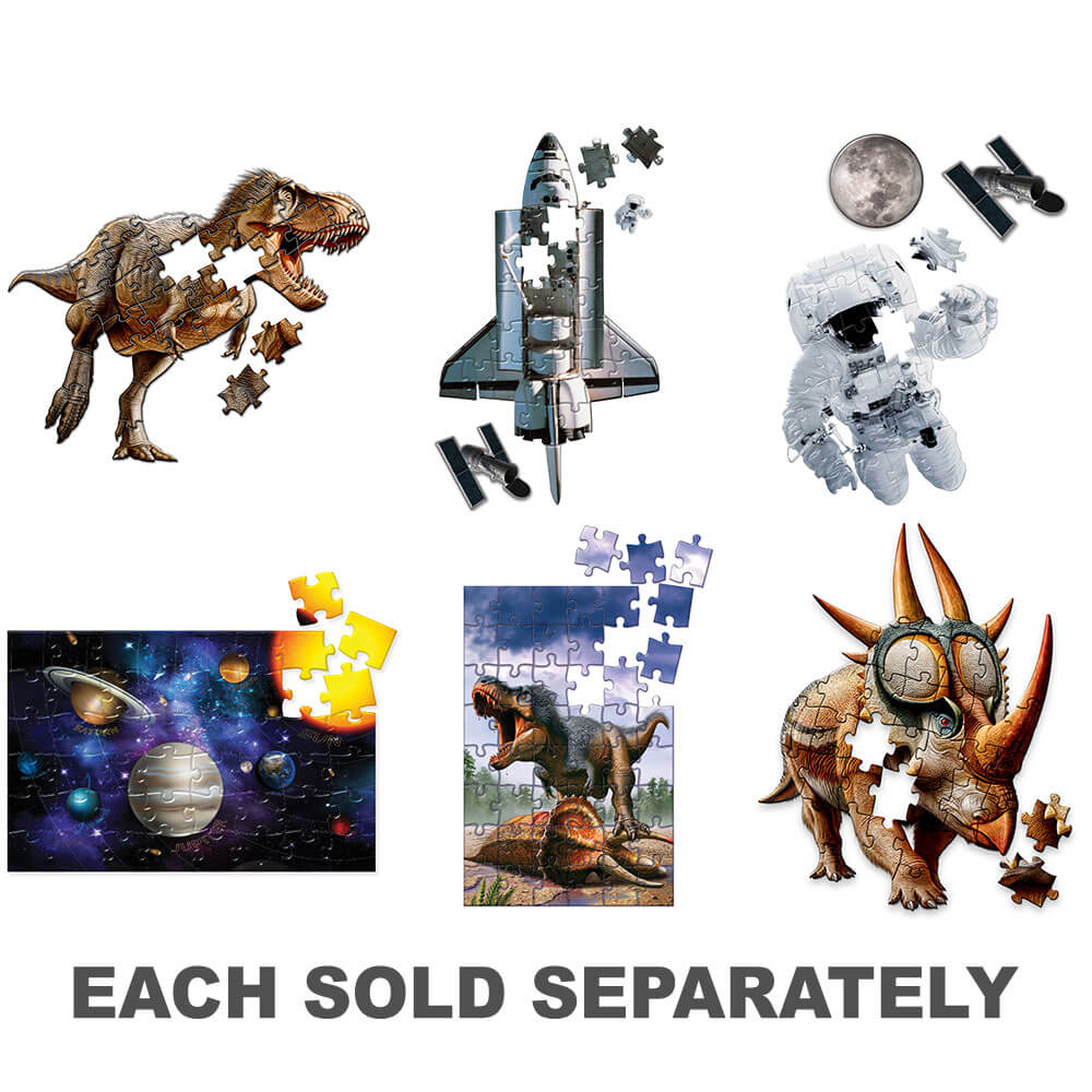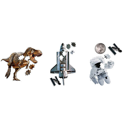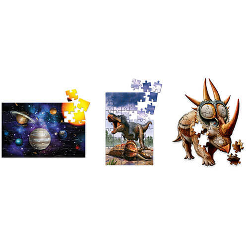Børn, der elsker dinosaurier, vil blive forbløffet over den voldsomme T-Rex vs. Triceratops-kunst og fascineret af den spiky Rubeosaurus! Rumelskende børn vil i mellemtiden blive begejstret af astronautpuslespillet, wowed af solsystemet eller imponeret af rumfærgen.