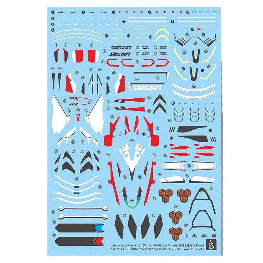 YF-29 Durandal Valkyrie fløjet af Alto Saotome i "Macross Frontier" er den nyeste post i Bandais HG "Macross" Model-Kit lineup! Dette kit vedtager "genvejsændring", som forenkler transformationssekvensen ved at bruge udskiftningsdele, mens den stadig drager fuld fordel af letheden af montering og bred bevægelse, der er unik for HG -serien. Sættet gengiver trofast den buede skønhed af de forreste vinger i jagertilstand og den karakteristiske silhuet i Gerwalk -tilstand. Dens Battroid -tilstand udtrykker også sin karakteristiske skarpe kropslinje. Skuldrene har en udtrækningsfuger for et udvidet bevægelsesområde, og en trevejs bevægelsesakse i brystet tillader en lang række bevægelsesområde til fronten, ryggen og begge sider. Missiletuge på skuldrene og benene kan indsættes, og kniven kan opbevares i skjoldet; Ekspressive hånddele er også inkluderet