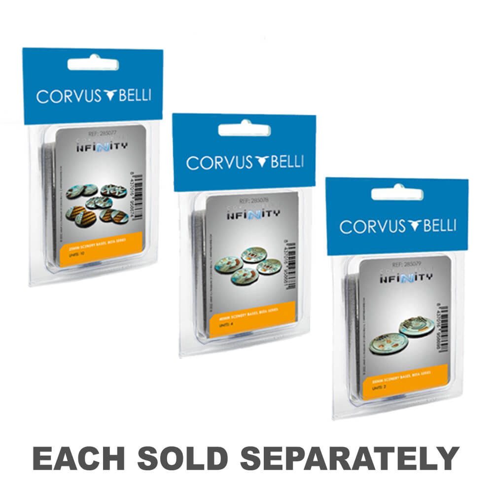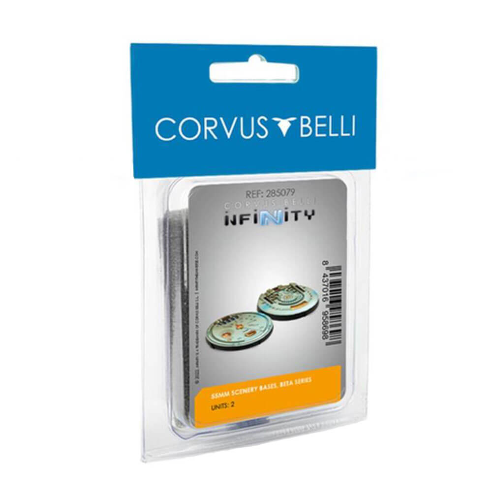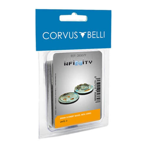 Blister af to injicerede termoplastiske 55 mm baser. Alle disse naturskønne baser har linje med brandmarkeringer for at forbedre afspilbarheden af dine modeller.