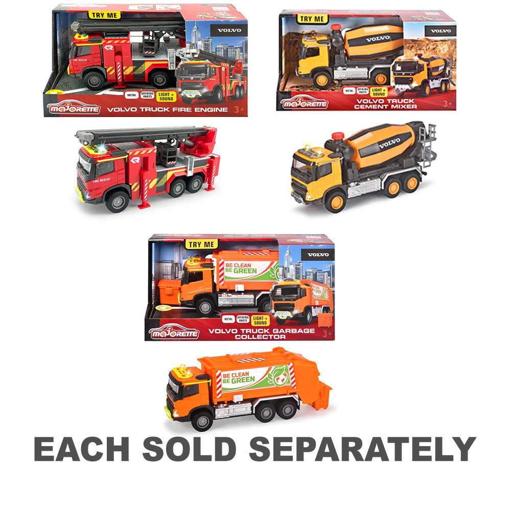 Majorette Volvo Truck Cement Mixer 1:43 Scale Diecast Model er en perfekt gave til alle fans af modelkonstruktionskøretøjer. Den har to forskellige lydeffekter såvel som forlygter, en tågelampe og to orange advarselslys til at advare nærliggende trafik. Der er også en udfoldelig roterende shoot og en blande tromle, der roterer for at lade materialet blive fodret ud gennem shooten, ligesom på en rigtig byggeplads. Takket være det robuste design kan Volvo Concrete Mixer håndtere selv de hårdeste opgaver. Driverens førerhus, brændstoftanken og mudguards er lavet af metal, og de andre dele er lavet af plast. Inkluderer 2 x AAA -batterier.