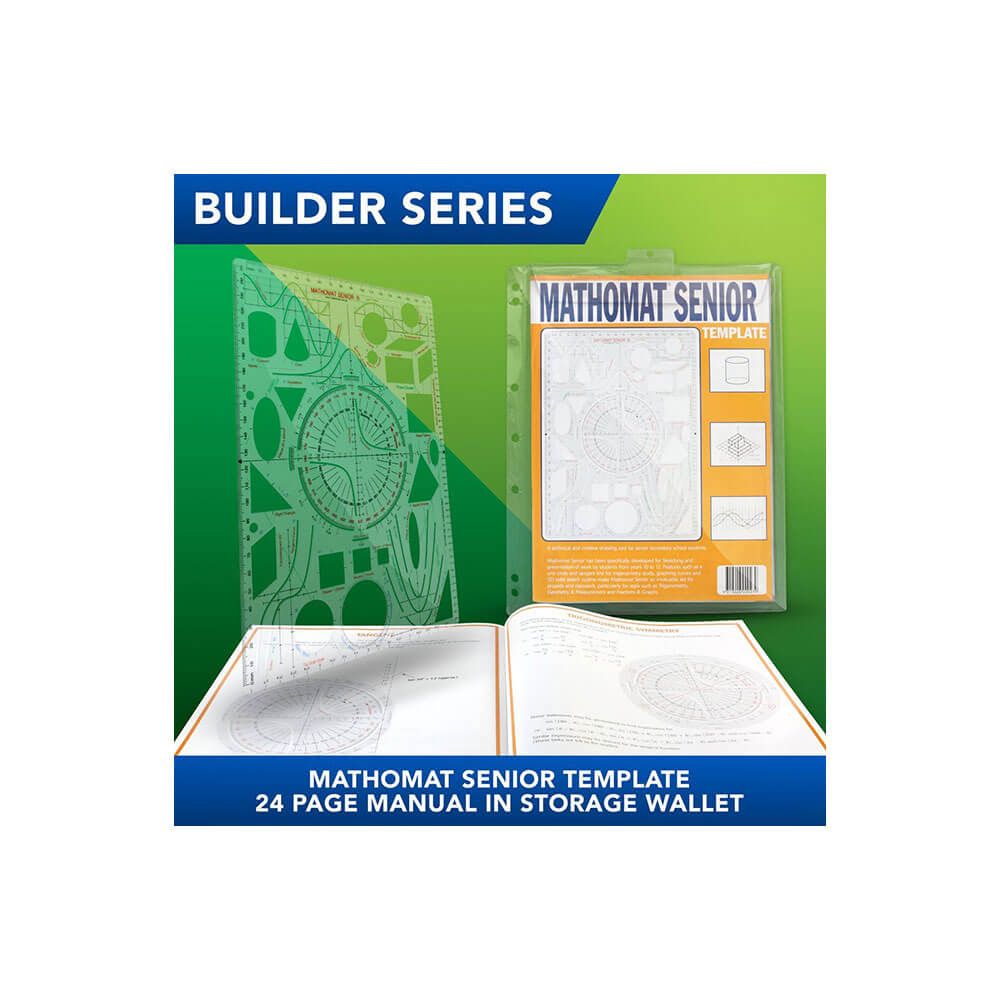 Mathomat Senior er specifikt udviklet til tegning og præsentation af seniorskolearbejde. Mathomat Senior inkluderer en central gradskive, der også er enhedscirklen til undersøgelse af trigonometri. En tangentlinje, der kan bruges med enhedskredsen. Grafkurver for sinus, kosinus, solbrun, kvadratisk, kubisk, parabolisk, hyperbola og normale frekvensfordelingskurver. Mathomat Senior inkluderer former til og skitsering af konturer for 3D -faste stoffer, der bruges i område- og volumenberegning.