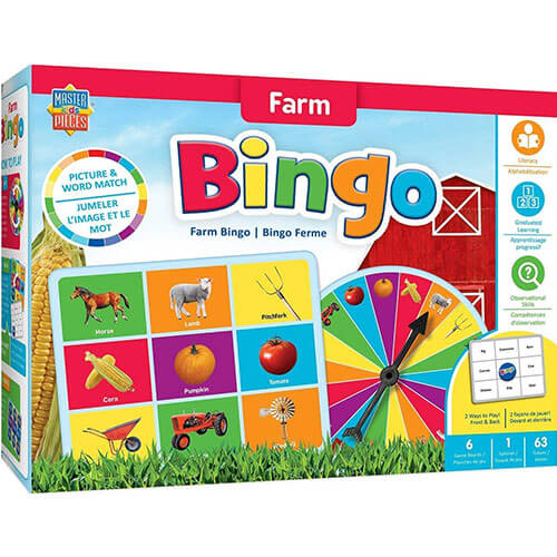 Lav alle 9 kampe, og vær den første til at råbe Bingo! Farm Bingo lærer børnene om forskellige ting, du kan finde på en gård, der genkender grisen, en stald, tomat og mere. Dette bingospil er designet til børn 3 år og ældre og er sjovt for hele familien. Start med at matche billeder og derefter gå senere på den anden side af dit bingobord, og find det rigtige ord. Det er et fantastisk spil at lære læsefærdighed og gøre observationer, mens du har det sjovt. Dette spil inkluderer 1 spinner, 6 spiltavler og 63 tokens.