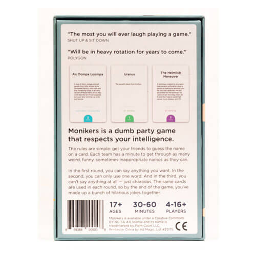 Monikers er et festspil baseret på den offentlige domænespil-berømthed, hvor spillerne skifter om at forsøge at få deres holdkammerater til at gætte navne ved at beskrive eller efterligne velkendte mennesker.