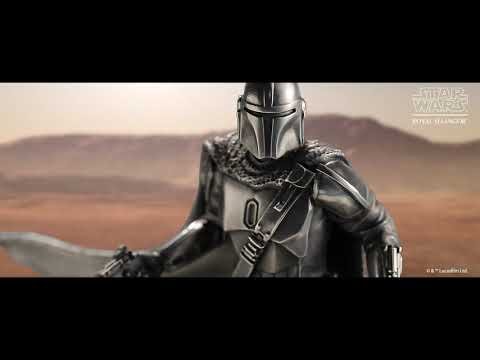 Mandalorianen, hans Beskar rustning, der børste med våben, reagerer på en trussel, klar til at beskytte barnet. Fin detaljeret i tin, på en base af sammensat harpiks.