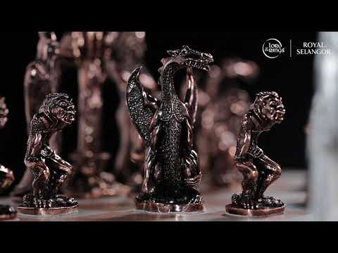 Kampen om Middle-Earth begynder. Aragorn og Galadriel fører et band med ents, troldmænd og hobbits mod Sauron og Shelobs Horde af Saruman, Gollum, Dragons og Orcs. Kastet i tin, med kobberbelægning for at skelne de modsatte hære, finder legen sted på et skakbræt af træ og tin -marquetry.