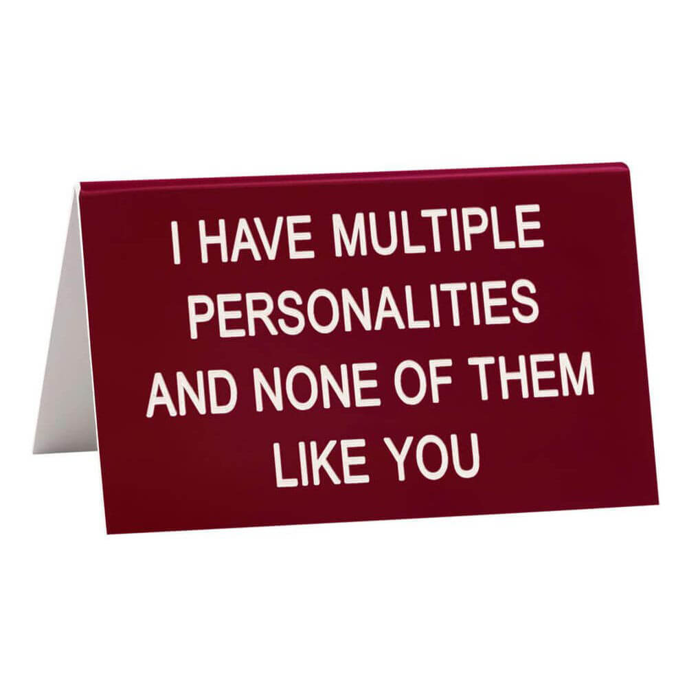 Opbryd monotonien af arbejdet og bring nogle LOL'er til kontoret med dette Bourgogne Desk -tegn fra Say What?. Billedtekst lyder: 'Jeg har flere personligheder og ingen af dem som dig'. Produkt måler 11,5 cm x 7cm.