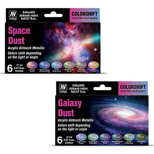 Sættene i colorshift-serien indeholder et udvalg af vandbaseret akryl luftbrush-metalliske farver.