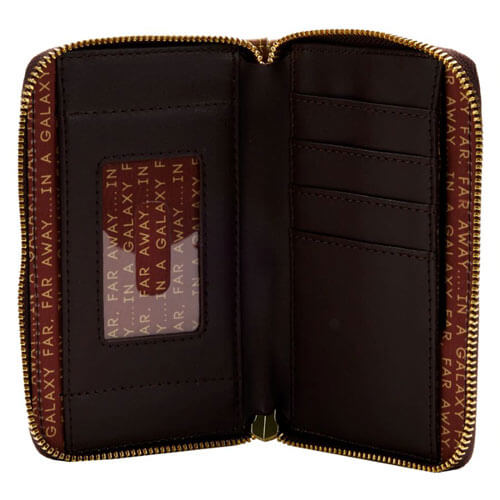 Udforsk galakseens fjern rækkevidde med den loungefly Star Wars lander Jakku Zip rundt om tegnebog. Når solen går ned på ørkenplaneten Jakku, optræder silhuetter af styrtede skibe og forladte kampudstyr i sandet. På fronten kan der findes en oversigt over Scavenger Rey, når hun kører på sin Landspeeder. Bagsiden af tegnebogen fortsætter solnedgangsfarven i Jakku's sandklitter. Dette stjernernes tilbehør har plads til at opbevare alle dine skatte med 4 slots til at holde kort og en klar slot til at holde dit ID.
