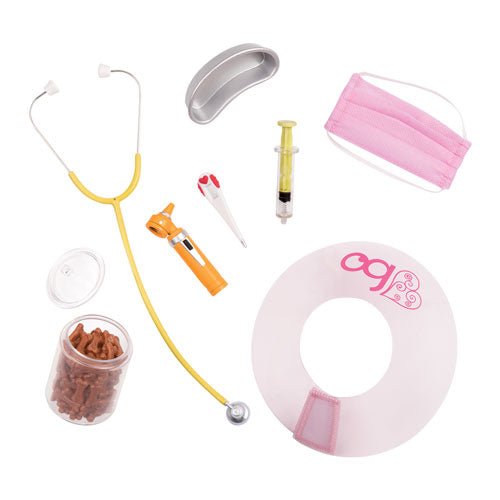 Hjælp kæledyr med at forblive sunde! Anais bærer sin dyrlægeuniform med en behagelig hvid langærmet t-shirt, lyserød dyrlægeuniform "skrubber" top og bukser og behagelige flade sko for at hjælpe hende med at blive på hendes fødder. Hun leveres med masser af veterinærværktøjer og tilbehør til at hjælpe hendes pleje af dyr, som et stetoskop, en krave til at tage på hvalpe eller killinger, et otoskop med et arbejdslys til at kontrollere hendes patients ører og mere!