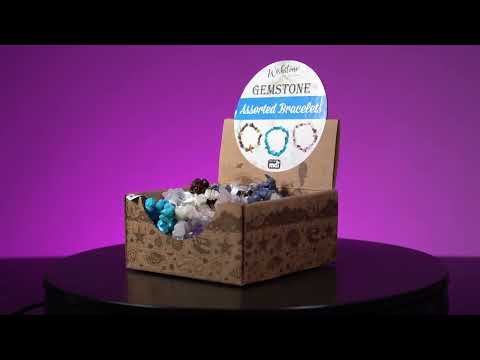 - Skibe tilfældigt mellem 8 forskellige stenarmbånd: rosenkvarts, blå howlite, ametyst, fluorit, sodalit, tiger øje, rockkvarts, hvid musling